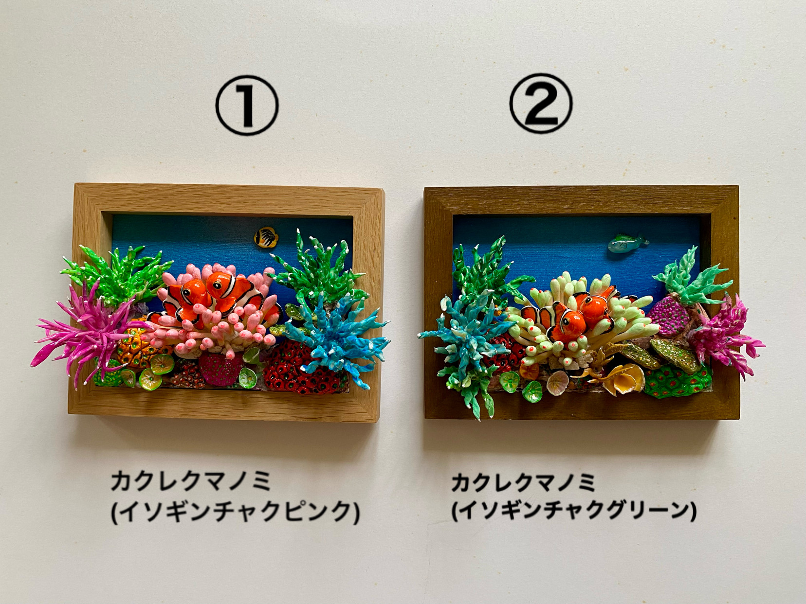 クマのみペアを真ん中にイソギンチャクと共存させて周囲には色とりどりの珊瑚礁をレイアウトしております。