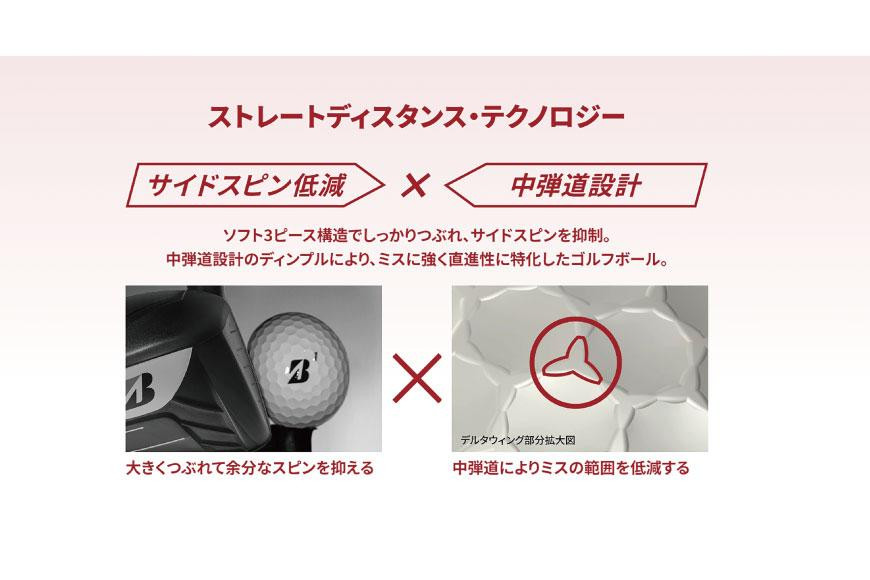 中心近くになるほど軟らかく設計したソフトグラデーショナルコアと高反発アイオノマーインナーカバーを組み合わせ、さらに高耐久ソフトアイオノマーカバーを搭載しました。ソフト3ピース構造がインパクト時にしっかりとツブれることでサイドスピンを低減させるとともに、中弾道設計のデルタウィングディンプル326がミスショット時のバラつきを抑制し、優れたストレート弾道を発揮する直進性重視設計のディスタンス系モデルです。また、ソフトな打感がグリーン周りでのコントロールショットのしやすさにも貢献しています。ボール表面には十字型のような形をしたサイドマークをプリントしており、ターゲットに合わせる際のアライメントの役割も果たします。