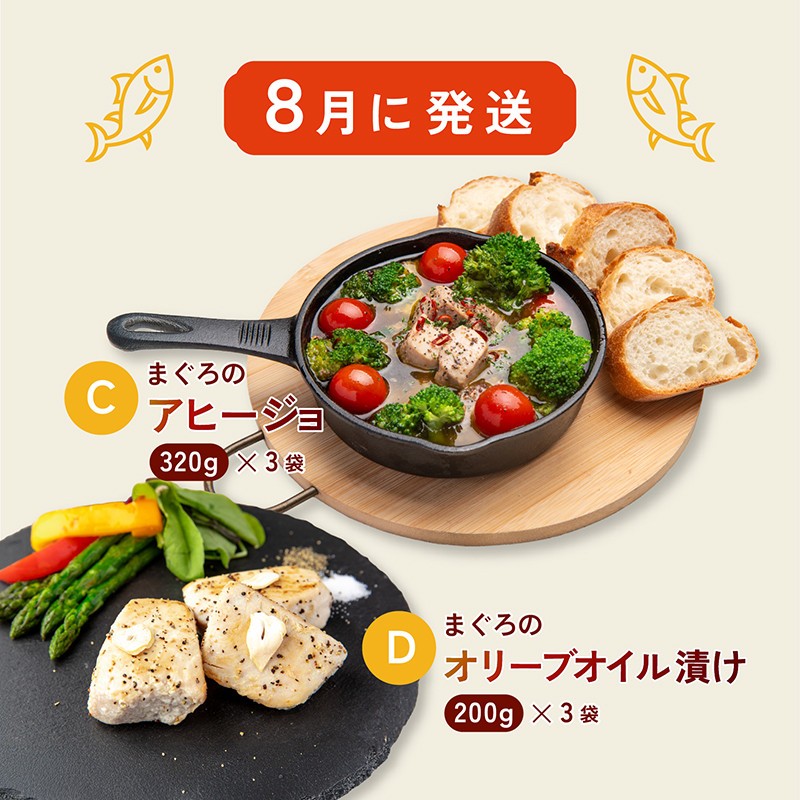 春はご飯が進む「ごろごろ漬け丼」、夏はワインや洋酒にも合う「オリーブオイル漬」と「アヒージョ」、秋冬は旨み濃厚な「お刺身セット」を年3回に分けてお届け。