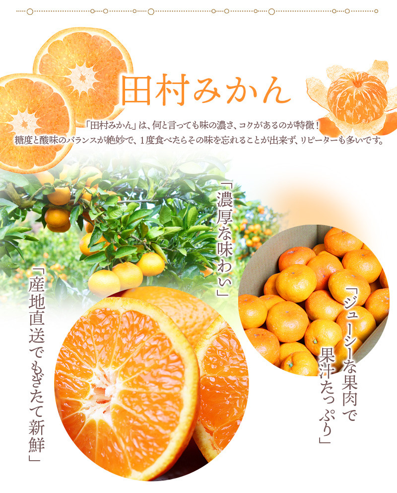 温暖な気候や海の潮風など自然環境に恵まれた湯浅町の田村地区で、太陽いっぱいに浴びた段々畑で育てられた田村のみかんは、甘みと酸味のバランスと濃厚なお味が絶妙で、また食べたくなるお味です。 青果市場などでも引き合いが高いため、少々、割高かもしれませんが、「田村みかん」と称される有田のブランドみかんを是非一度、召し上がって下さい。 ※画像はイメージです。 ※天候等により、発送日が前後する可能性があります事をご理解下さい。 ※「S」「M」「L」のいずれかのサイズをお届けします。サイズのご指定はできません。 ※もちろん、果実ですので、収穫する木などによって、多少の味の差はあると思います。 ※等級は、秀品(贈答用)となりますが、青果市場等でも認可されている許容範囲内での多少、見劣りのするものも入ります事をご了承下さい。お味は変わりません。 ※梱包時には割れや裂けのないものをお入れしておりますが、配送時の取り扱い等で割れや裂けが発生する可能性がございます。 ※自然に割れたり裂けたりはしませんが、底面のみかんの割れや裂けが発生すると腐敗につながりますので、到着しましたら、箱からすべてのみかんを取り出してご確認下さい。 ※生もの(農産物)ですので、なるべく涼しく風通しの良い場所で保管し、新鮮なうちにできるだけお早めにお召し上がり下さい。 【こちらのお礼品は湯浅町と太地町との共通返礼品となります】 【平成31年総務省告示第179号第5条第8号イ「市区町村が近隣の他の市区町村と共同で前各号いずれかに該当するものを共通の返礼品等とするもの」に該当する返礼品として、和歌山県内で合意した市町村間で出品しているものです。】