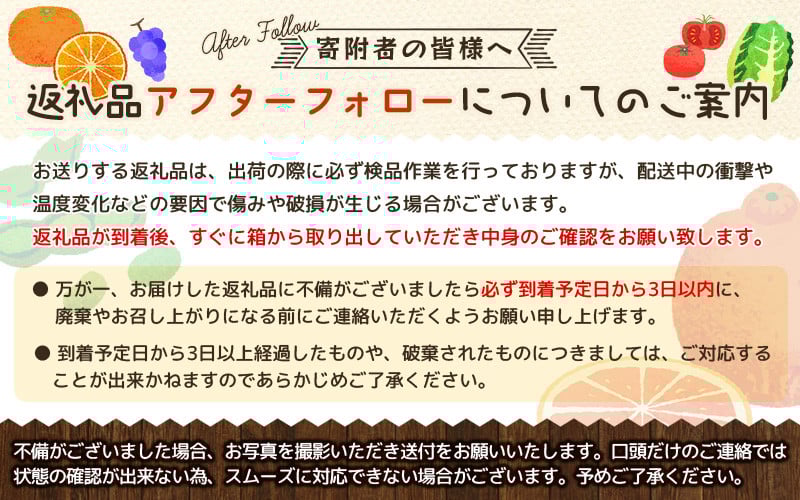 2026年4月中旬頃〜2026年4月下旬頃に順次発送予定(お届け日指定不可) 商品が到着致しましたらすぐに開封後、できるだけ涼しいところで保管頂きお早めにお召し上がりください。 ※誠に申し訳ございませんが、離島へのお礼品の配送はお受けできません。 ※事前にお申し出がなく、長期不在等によりお礼の品をお受取りできなかった場合、再発送はできません。あらかじめご了承くださいませ。 出荷の際検品後発送しておりますが、万一商品に問題がございましたら破棄やお召し上がりになる前にご連絡ください。 ※到着予定日から、3日以上経過したものや、破棄されたものにつきましては、ご対応することが出来ませんのであらかじめご了承ください。 |