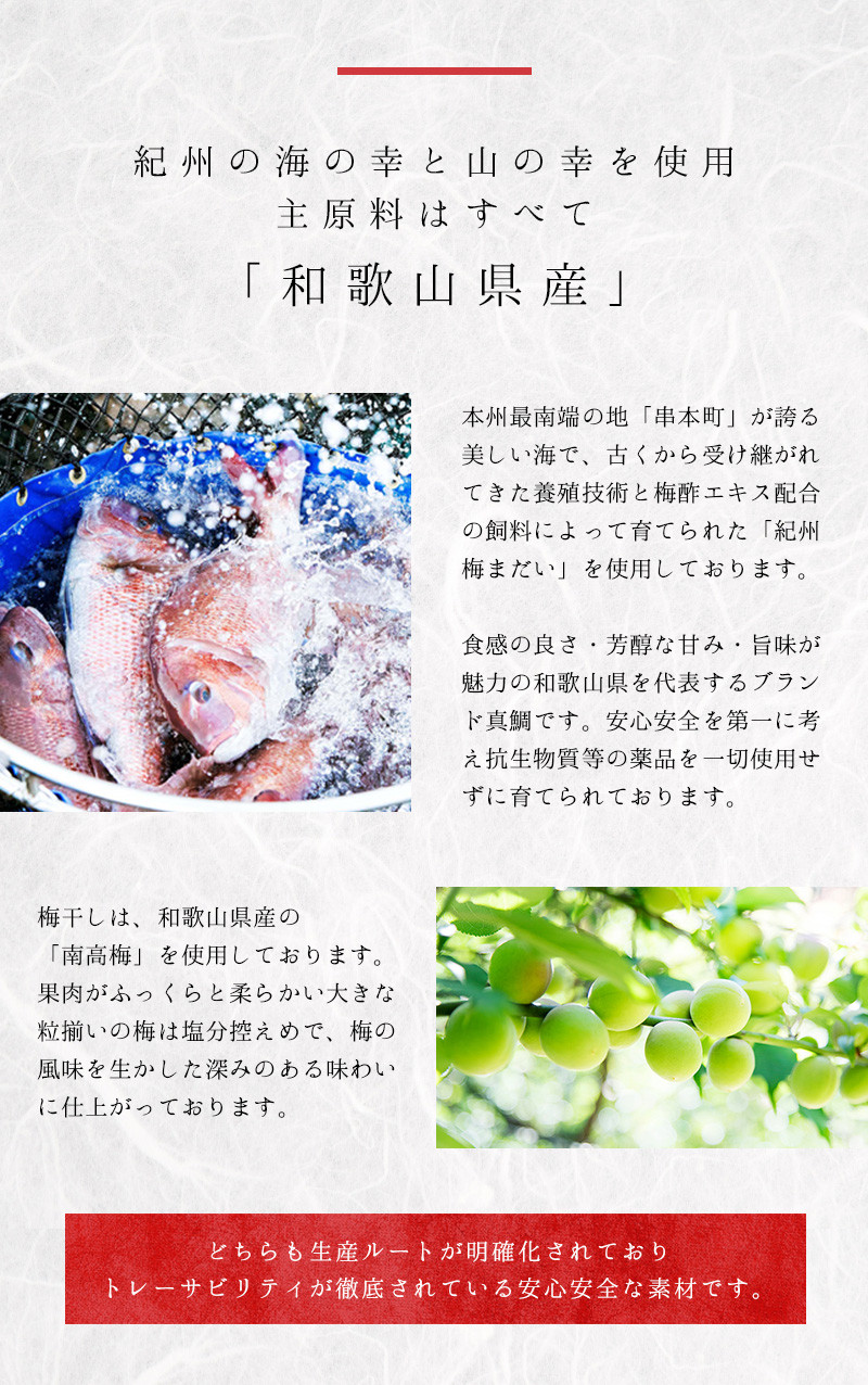 紀州南高梅の中に、甘酢みそで味付けした「紀州梅まだい」のほぐし身を詰めました。