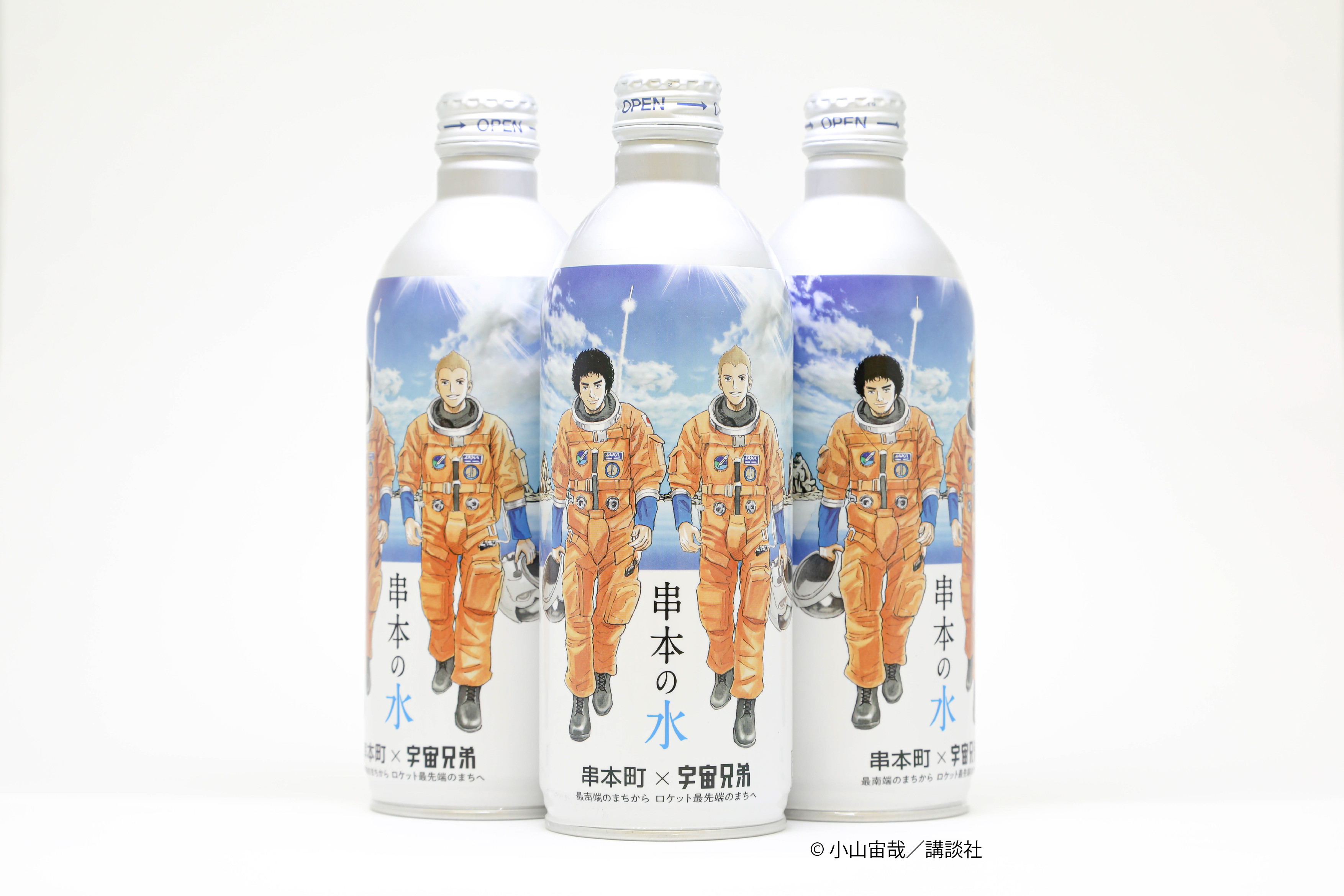 宇宙兄弟の串本オリジナルイラストがプリントされた串本の水。アルミボトル入りで長期保存できるので、備蓄用(賞味期限:2032年1月)としても使えます。
