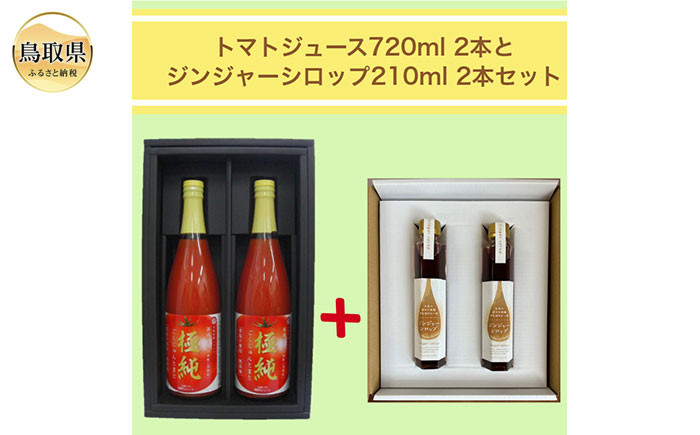 鳥取県日南町産の大玉完熟トマトから作りました無添加・無加水・食塩不使用のストレートジュース『極純』720mlと、清き山水で育てた生姜と奄美諸島産のきび砂糖、愛媛県産のレモン果汁だけを使い無加水で作りました『ジンジャーシロップ』210mlを各2本ずつをセットにしてお届け致します。