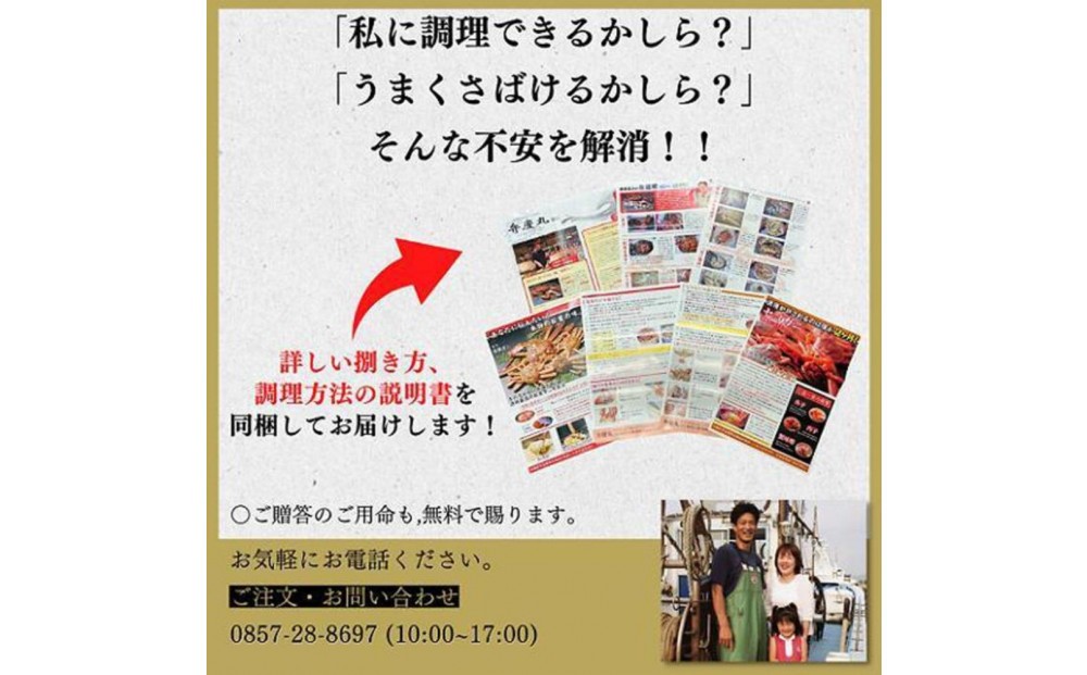| 容量 | 1~4本の足折れなどの活生・松葉ガニ2~4枚 (全部で1キロ~1.3キロ前後) ※水揚げ状況により、誤差が生じますのでご了承ください。 ※目安人数:2~3人様 ※活きた松葉ガニは非常に繊細なため、配送中の振動やストレスで自ら足を落とす場合がございます。 また足が生えて出て来る事もあり、防御本能の習性のひとつで活きている証ですので、ご理解下さい。 ※活きた松葉ガニのため、冷凍保存・着色料・添加物は一切、使用しておりませんので、到着後、出来るだけ早くお召し上がりください。 配送途中で死んでしまっても、お刺身で食べて頂ける鮮度状態ですので、ご安心ください。 |