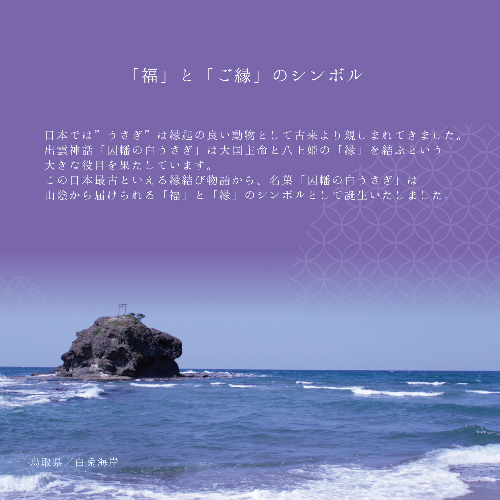 「因幡の白うさぎ」は昭和43年に生まれ、販売から55年、皆様に愛されてまいりました。常に品質の向上に励み、愛された美味しさを守りながらも、より食べやすく、より安心な素材選びを追求しています。コクと風味を際立たせるため地元の大山バターを使用し甘さを控え、生地をしっとりとさせ、上品な黄身餡をやさしく包み込みました。抹茶餡には、島根県松江市の老舗茶舗「中村茶舗」の抹茶を練り込みました。白うさぎの「赤目」は、工場見学に来ていた小学生の「目があった方が可愛い」の一言で入れるようになりました。赤目の原料は赤大根から抽出した天然色素を使用しています。箱には紐が美しく結んであります。これは、結び目を"人"という字に見えるように結ぶことから"御縁結び"と呼ばれています。
