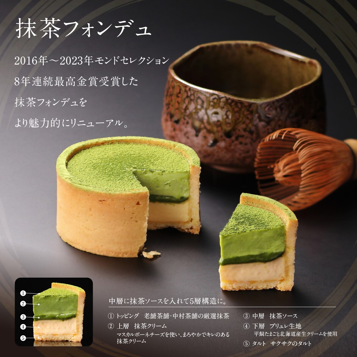 抹茶フォンデュは2016年よりモンド・セレクション9年連続最高金賞を受賞したKAnoZA一番人気のフォンデュ。5層構造となっており、タルト生地にマスカルポーネとホワイトチョコをブレンドしたまろやかでキレのある抹茶クリーム、丁寧に焼き上げた口当たり滑らかなブリュレ生地、間に味に深みをもたらす濃い抹茶ソースを挟んで、抹茶粉を振りかけた抹茶好きの方にオススメしたい濃厚な味わいです。