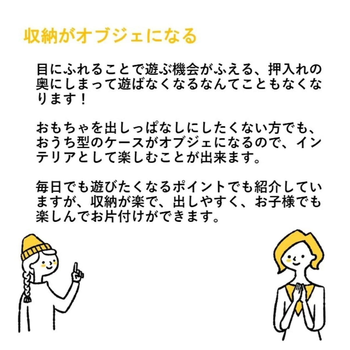 おもちゃを出しっぱなしにしたくない方でも、おうち型ケースがオブジェになるので、インテリアとして楽しむことができます。