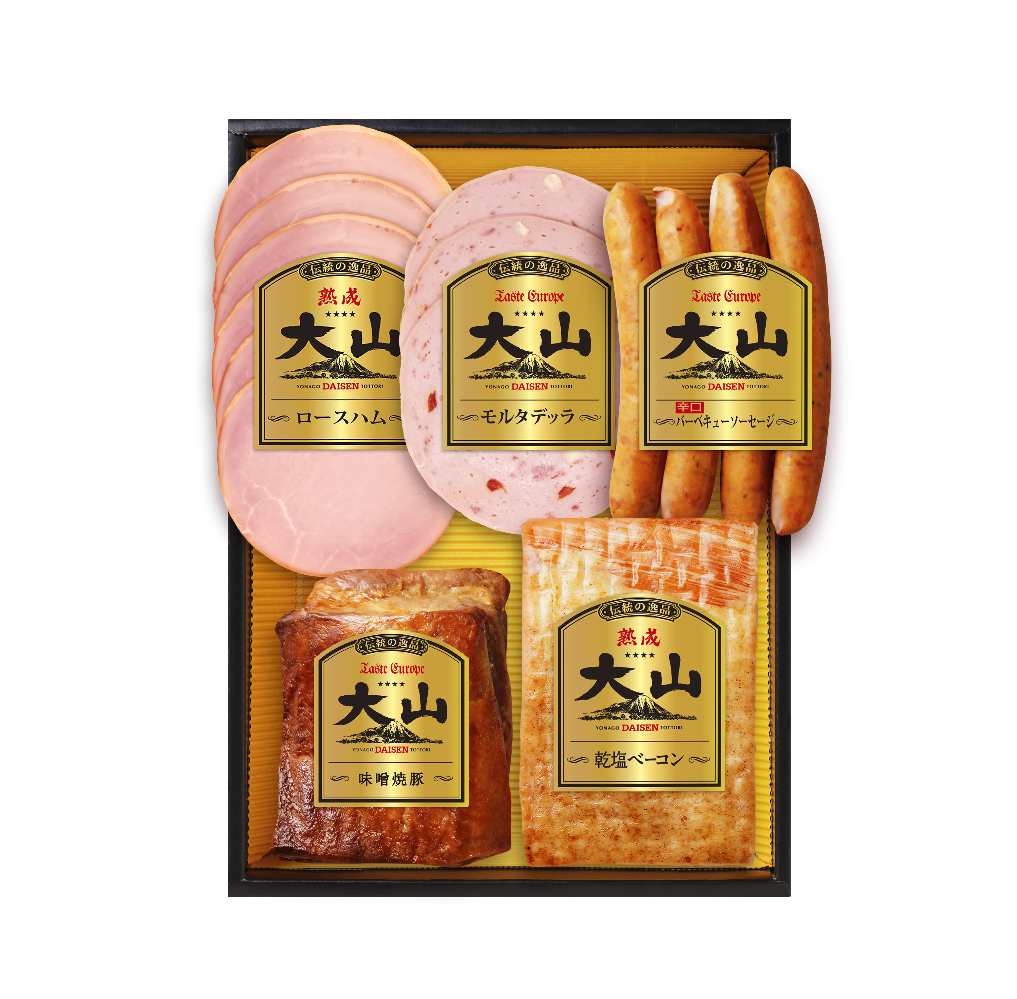 山陰の名峰大山(だいせん)。その麓、鳥取県米子市にて1954年創業、大山ハムのおいしさがバラエティ豊かに味わえるセットです。ブロックタイプで料理の幅が広がる熟成乾塩ベーコン(2024年DLG金賞受賞)に、味噌をたっぷり加えた特性ダレに漬け込み香ばしく焼き上げた味噌焼豚に加え、色鮮やかなパプリカとチーズを加えて仕上げたモルタデッラ、人気の熟成シリーズから豚ロース肉を熟成後スモークした熟成ロースハム、ピリッと辛口なバーベキューソーセージ、5品を詰め合わせた風味豊かに堪能いただけます。