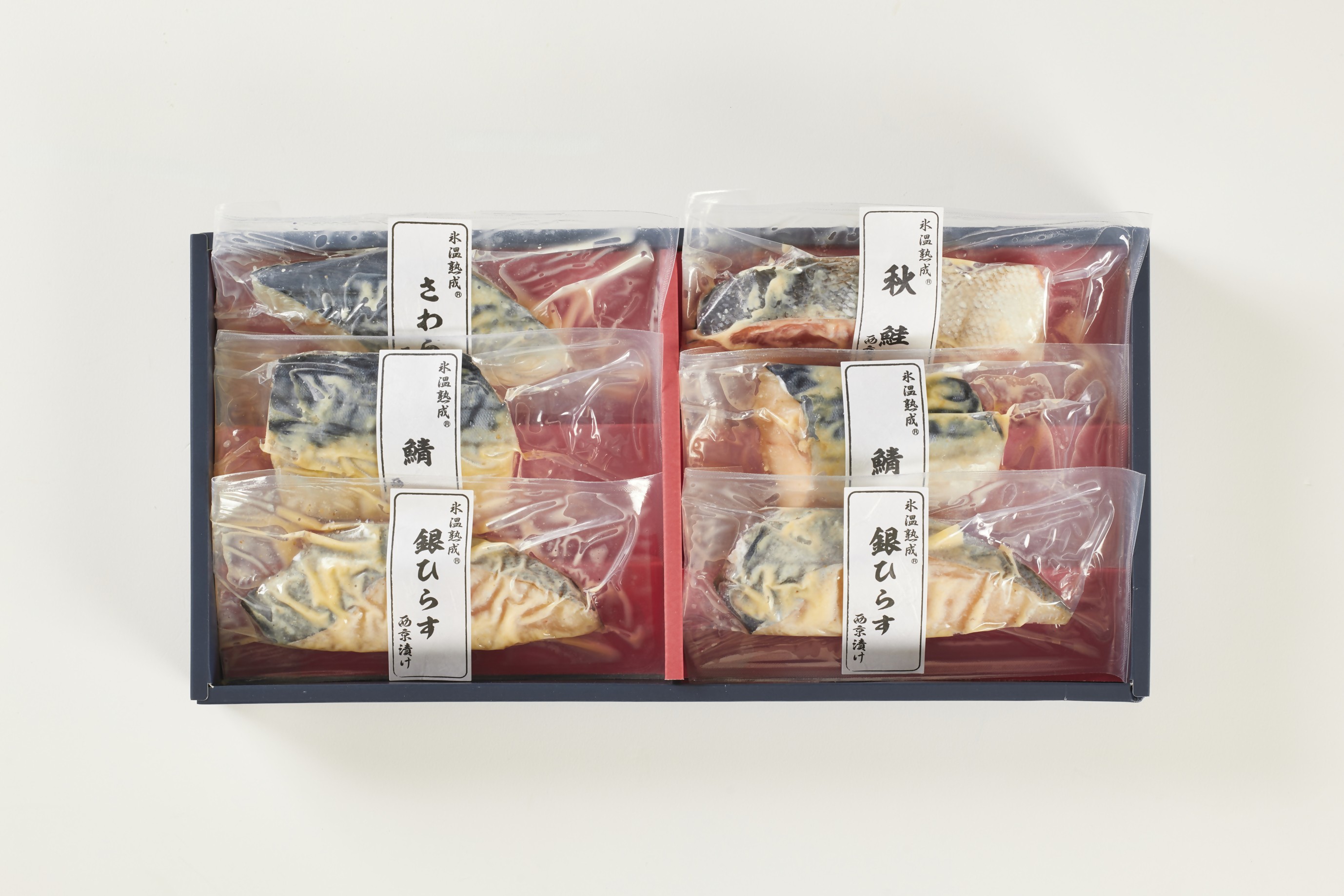 | 容量 | 銀ひらす西京漬け60g×2、鯖西京漬け60g×2、秋鮭西京漬け60g×1、さわら西京漬け70g×1 |