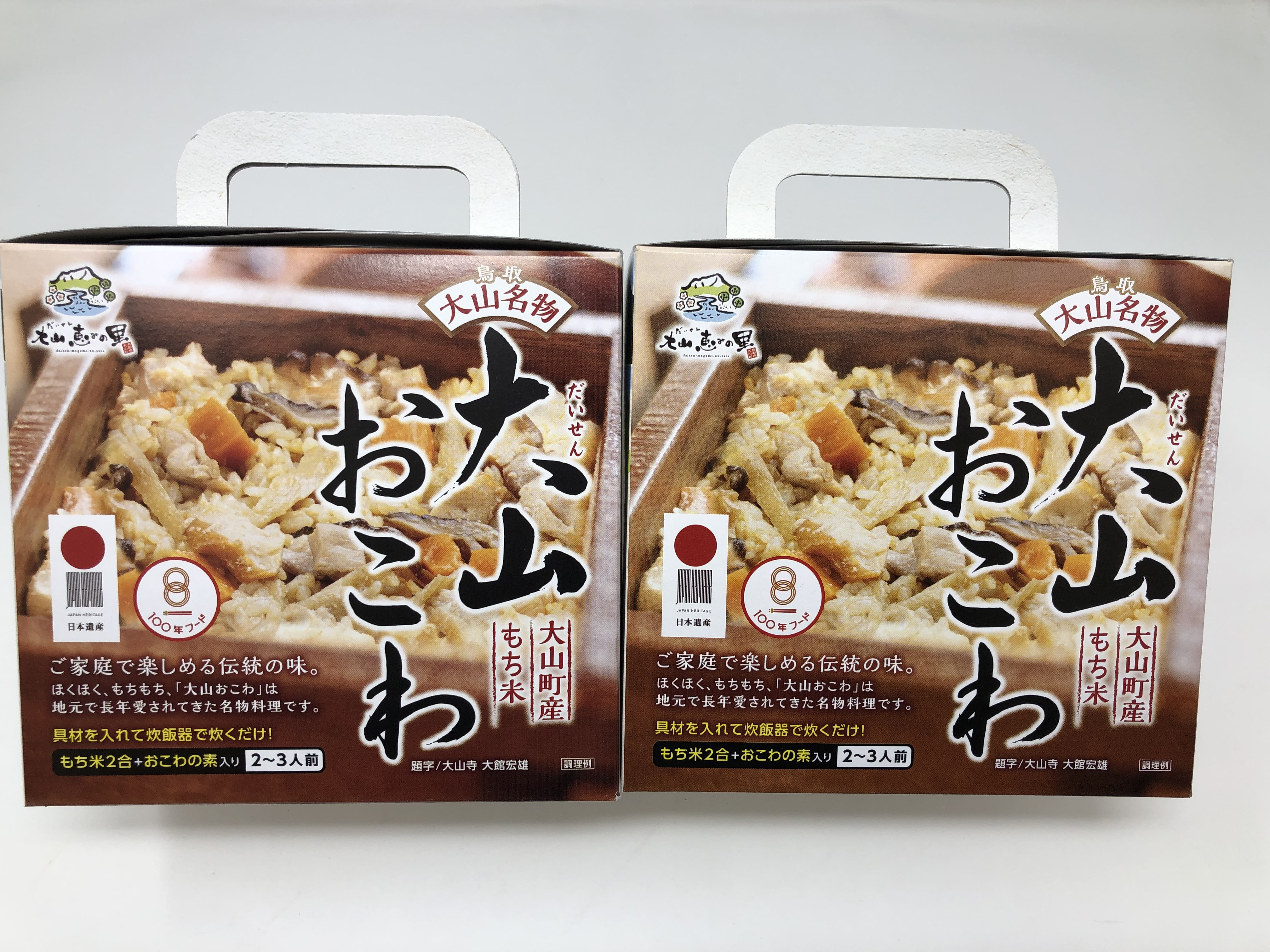 文化庁から100年フードに認定された「大山おこわ」を家庭の炊飯器で簡単に作ることができるレトルトと、もち米2合をセットにしました。