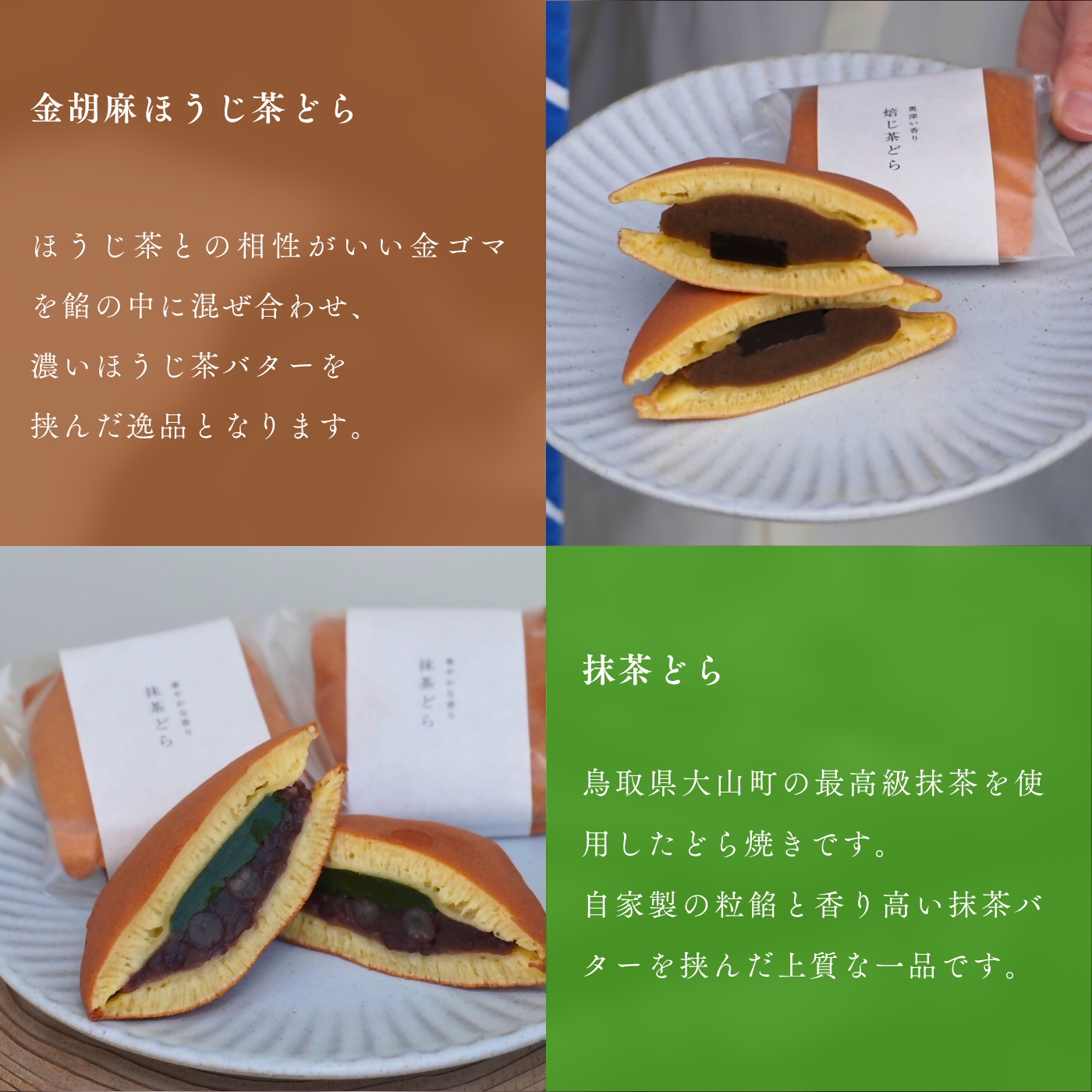 | 容量 | 粒餡どら:2個 こし餡どら:2個 ほうじ茶どら:1個 抹茶どら:1個 |
