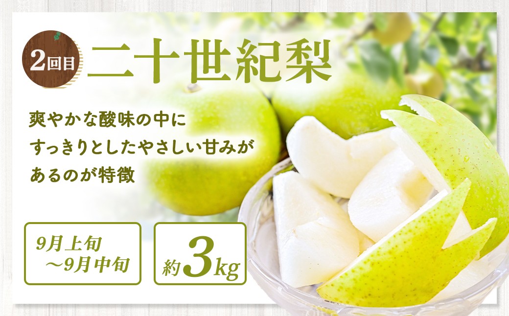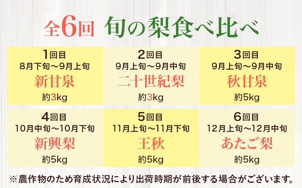 令和8年のお届けとなります。 ※農作物のため育成状況により出荷時期が前後する場合がございます。 1回目:新甘泉 8月下旬~9月上旬 2回目:二十世紀梨 9月上旬~9月中旬 3回目:秋甘泉 9月上旬~9月中旬 4回目:新興梨 10月中旬~下旬発送 5回目:王秋 11月上旬~11月下旬 6回目:あたご梨 12月上旬~12月中旬 |