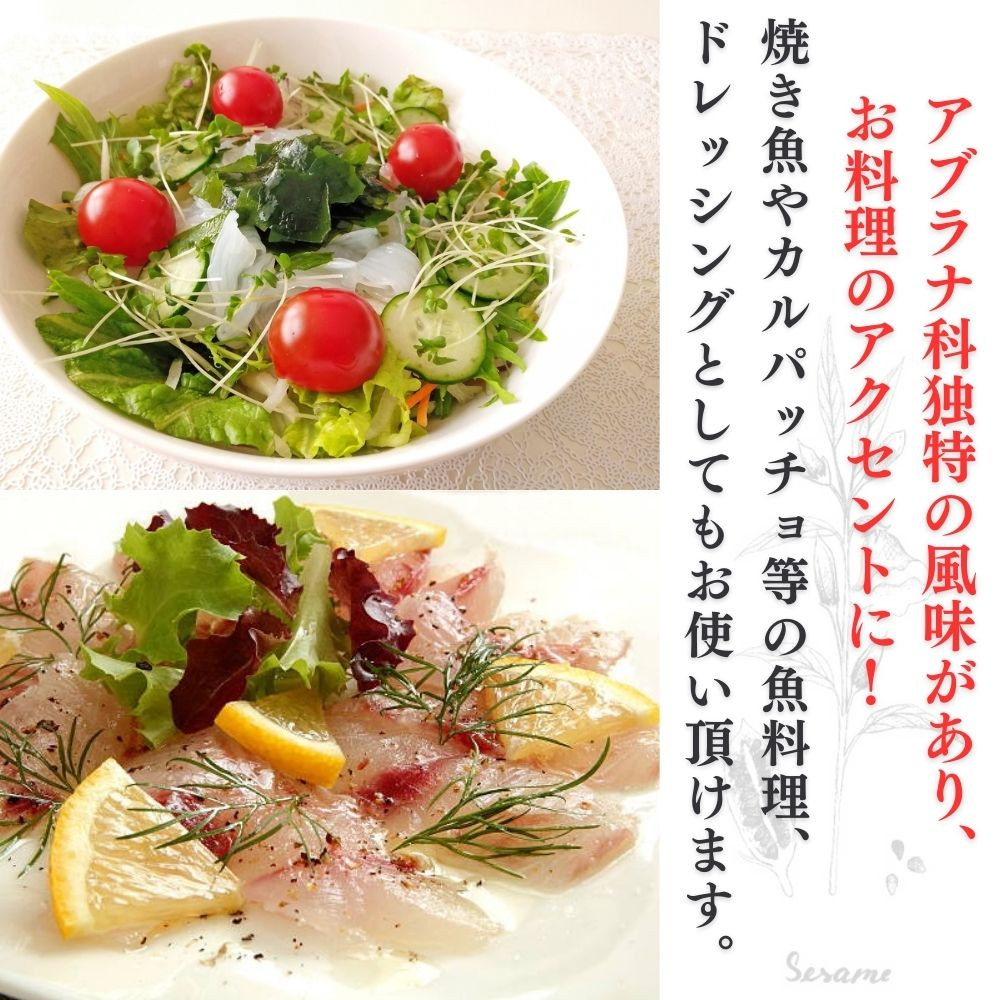アブラナ科独特の風味がありお料理のアクセントになります。サラダ、グリル野菜、蒸し野菜などお野菜メインのお料理にちょっと垂らして使用するとコクと風味がアップ。