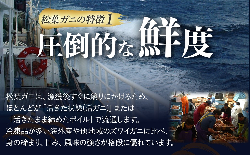 安心の県下統一タグ付きです。冬だけの味覚、松葉ガニならではの甘みと旨みをお楽しみください。