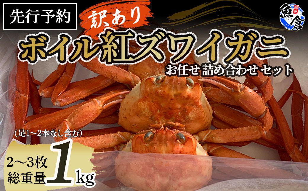地域の生産者応援の品 チョイスPayポイントと交換できる品 訳アリでも美味しさ・品質は変わらない「大満足」な返礼品! 今だけ限定価格!【11月より値上げ】【魚倉】ボイル 訳あり 紅ズワイガニ 詰め合わせ 1kgセット(足1~2本なし含む) カニ詰め合わせ ベニズワイガニ 釜茹で 期間限定 カニ ズワイガニ カニ爪 ボイル 冷蔵 わけあり ずわいがに 限定価格 限定寄付額 値上対象 鳥取県 倉吉市
