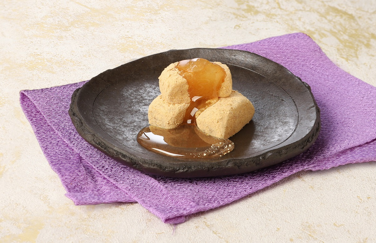 鳥取県産の良質な餅米を使ったやわらかなきな粉餅に、鳥取名産の二十世紀梨で作った特製の「梨みつ」をかけてお召し上がりください。