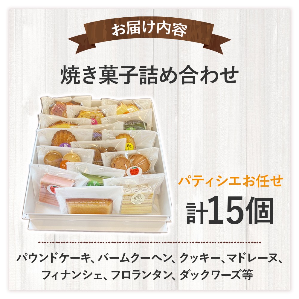| 容量 | パウンドケーキ、バームクーヘン、クッキー、マドレーヌ、フィナンシェ、フロランタン、ダックワーズ等 パティシエお任せ15個入り |