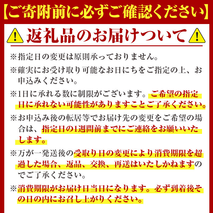 ※万が一発送後の受取り日の変更により消費期限を超過した場合、返品、交換、再送はいたしかねますのでご了承ください。