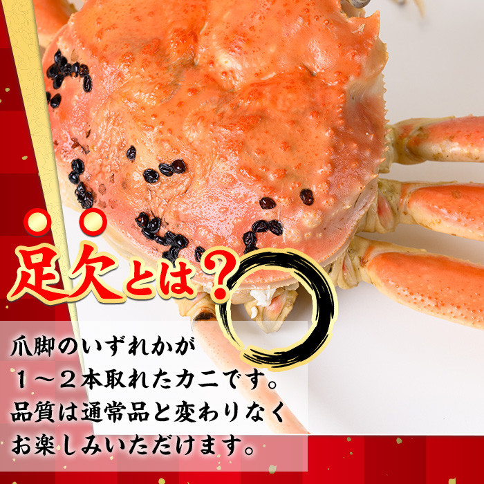 | 容量 | 境港産松葉ガニ 足欠け 中サイズ2枚(800g以上) ※足欠けとは爪脚のいずれかが1~2本取れたカニです。 |