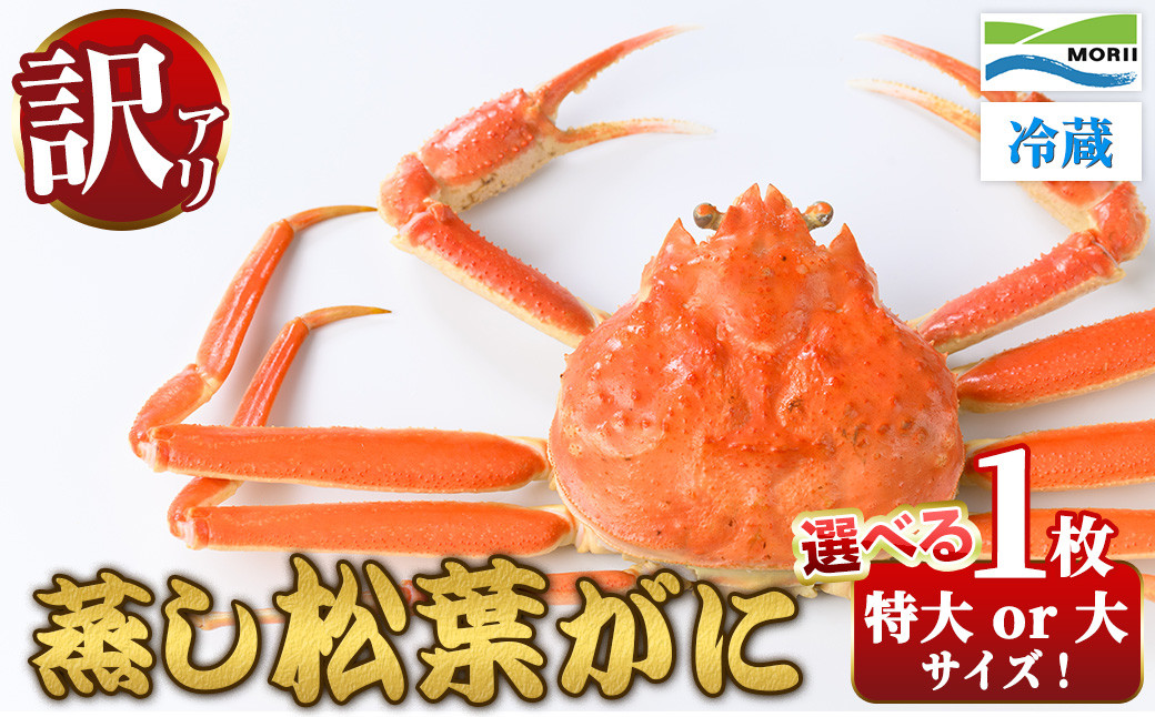 松葉がにを弊社独自の製法で丁寧に蒸し上げ旨味を閉じ込めました。 <選べる容量・11月中旬~2月下旬配送予定><訳あり・足欠け>鳥取県産蒸し松葉がに(大 / 特大1枚)【sm-AM008・sm-AM011】【モリイ食品】