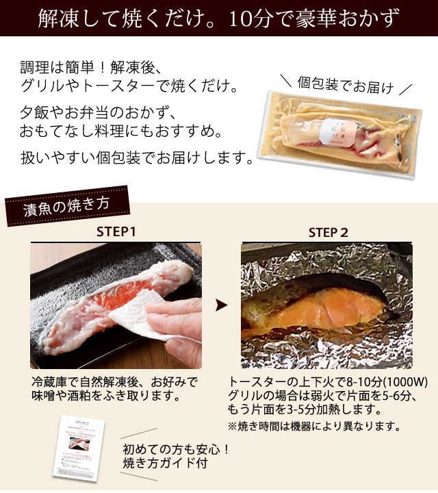 | 容量 | ・西京漬4種8切セット(紅鮭、さわら、サバ、赤魚×各2) ・西京漬5種10切セット(銀だら、紅鮭、さわら、サバ、赤魚×各2) ・銀鱈4切含む4種8切セット(銀だら西京漬、銀だら粕漬、紅鮭西京漬、鰆西京漬×各2) 上記よりいずれかをお選びください |