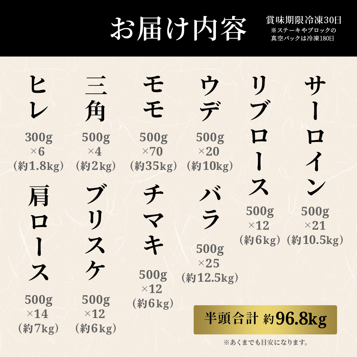 | 容量 | 【鳥取和牛 半頭分】 ※あくまでも目安になります。 サーロイン 500g×20パック(約10kg) リブロース 500g×12パック(約6kg) 肩ロース 500g×17パック(約8.5kg) ウデ 500g×20パック(約10kg) バラ 500g×23パック(約11.5kg) モモ 500g×70パック(約35kg) チマキ・ネック500g×12パック(約6kg) ブリスケ 500g×12パック(約6kg) 三角 500g×4パック(約2kg) ヒレ 300g×6パック(約1.8kg) |