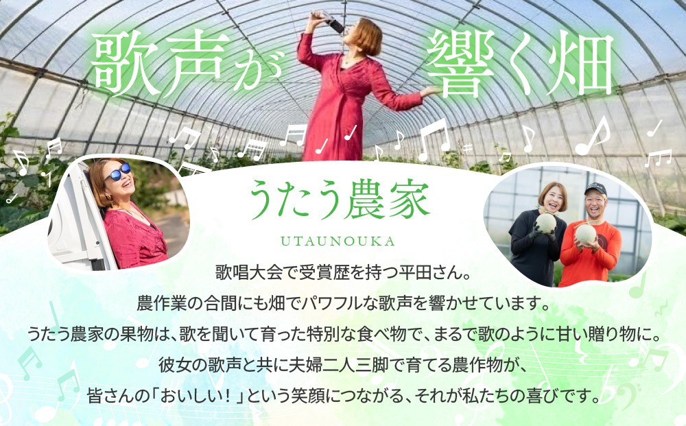 農作業の合間には畑でパワフルな歌声を響か作物に栄養を吹き込み、美味しさを育んでいます.夫婦二人三脚で育った農作物が、皆さんの「おいしい!」という笑顔につながる、それが私たちの喜びです。