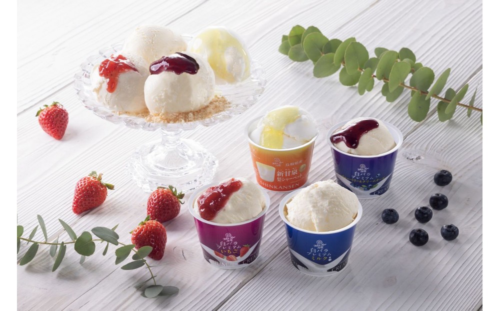 | 容量 | アイス(ミルク)110ml×2個 アイス(いちご・ブルーベリー&クリームチーズ)95ml×各2個(計4個) シャーベット(鳥取県産新甘泉梨シャーベット)95ml×2個 |