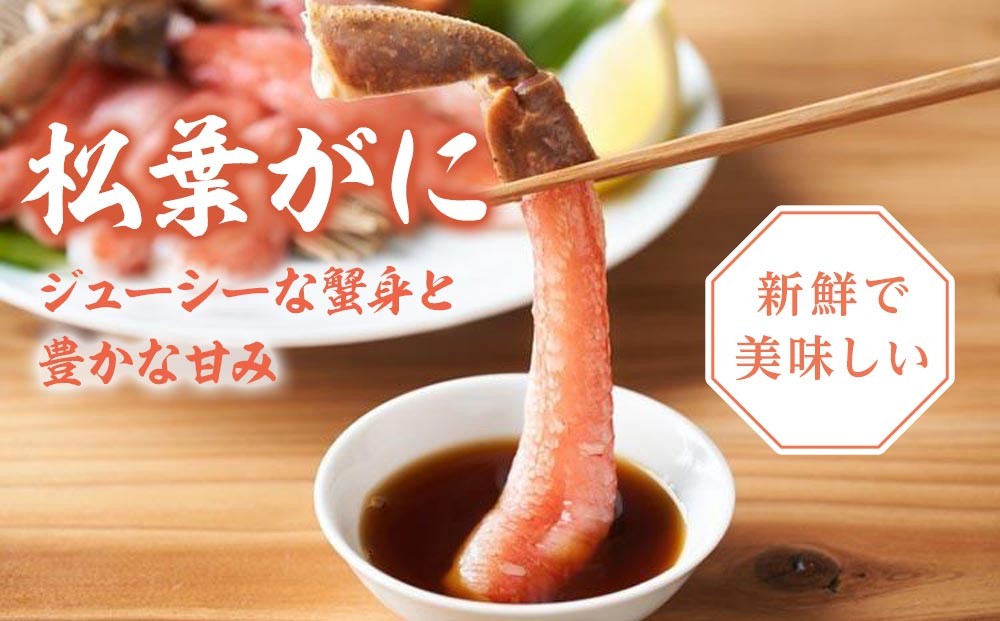 水揚げされたばかりの松葉がにを、職人が美味しく浜茹でしてお届けします。上品で繊細な蟹身からあふれ出すジューシーな蟹汁と蟹身が絶妙に混ざり合う食感と味わいはこのうえない贅沢です。焼きがにや鍋に入れても美味しくお召し上がりいただけます。