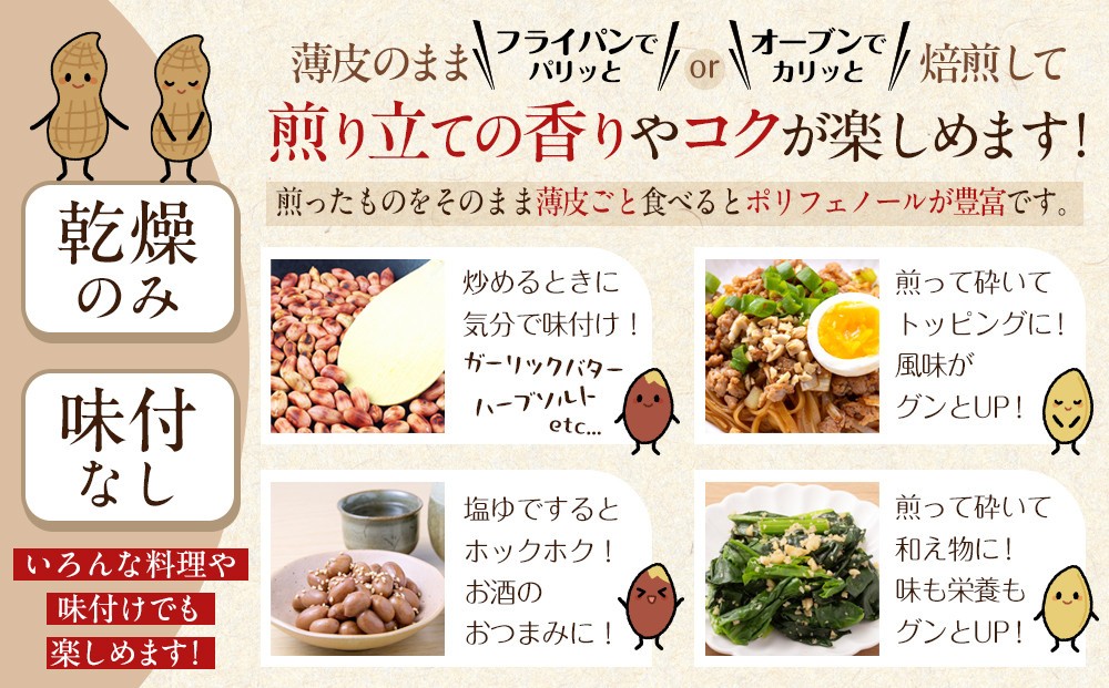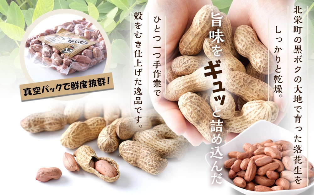 北栄町の黒ボクの大地で育った落花生を乾燥機でしっかりと乾燥させ、一つ一つ手作業で殻をむき仕上げた逸品です。乾燥させることにより旨味をギュッと詰め込むことができます。乾燥のみ行った状態のため、そのまま焙煎し煎り立ての味や香り、ゆでたてのホクホクした食感を楽しんだり、落花生のご飯としてもお楽しみいただけます。