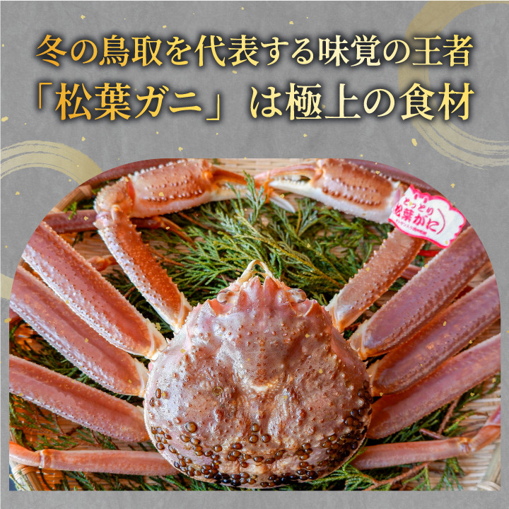 ■ 返礼品説明 山陰の冬の味覚「松葉ガニ」。なかでも、鳥取県内の沖合底引き網漁船が水揚げした甲羅の大きさが11cm以上の松葉ガニには、安心と信頼の証であるブランドタグが取り付けられ高級品として取引されます。ゆでガニ、カニすき、雑炊のほか、焼き蟹で美味しく食べられます。しっとりとした身と濃厚な旨みの味噌をご堪能ください。仕入れのときまで生きていたものですので、鮮度も抜群です。 ※写真では左右5本ずつの脚がついていますが、1番下の細い脚(小指)がないものもございます。小指がないカニも訳あり品ではなく正規品となりますので、あらかじめご了承ください。 ■ みくりや漁港のカニ祭り 大山町のみくりや漁港は県下でも有数の水揚げを誇る漁港で、年一回松葉ガニの解禁があると「カニ祭り」が開催されます。 漁港がある町から新鮮なカニをお届けします。是非一度お召し上がり下さい。 【 発送連絡について 】 発送前に事業者から寄付者様へ連絡をいたします。連絡がついた方から順次発送いたしますので、お申し込み時には、日中にご連絡が取れるお電話番号を必ずご記入ください。寄附者様以外の方にお送りする場合は、送付先の方へご連絡しますので、必ず寄附者様から送付先の方へご一報くださいますようお願いします。(事業者:お魚センターみくりや 0859-54-5511) ※ご連絡がとれない場合は、商品の準備が整い次第、随時発送とさせていただきますのでご了承下さい。 【 ふるさと納税に関するお問い合わせ 】 鳥取県大山町役場 企画課 営業企画室 (電話) 0859-54-5202 (FAX) 0859-54-5216 (mail) furusato@daisen.jp