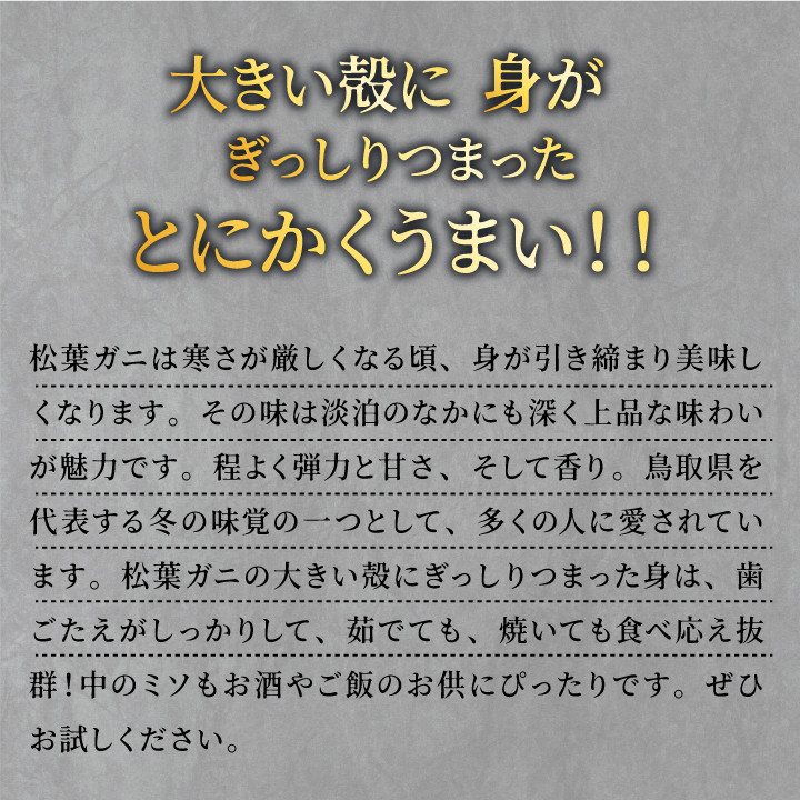 ■ 返礼品説明 山陰の冬の味覚「松葉ガニ」。なかでも、鳥取県内の沖合底引き網漁船が水揚げした甲羅の大きさが11cm以上の松葉ガニには、安心と信頼の証であるブランドタグが取り付けられ高級品として取引されます。ゆでガニ、カニすき、雑炊のほか、焼き蟹で美味しく食べられます。しっとりとした身と濃厚な旨みの味噌をご堪能ください。(こちらはボイルしてありますので、そのままお召し上がりいただけます。) ※写真では左右5本ずつの脚がついていますが、1番下の細い脚(小指)がないものもございます。小指がないカニも訳あり品ではなく正規品となりますので、あらかじめご了承ください。 ■ みくりや漁港のカニ祭り 大山町のみくりや漁港は県下でも有数の水揚げを誇る漁港で、年一回松葉ガニの解禁があると「カニ祭り」が開催されます。 漁港がある町から新鮮なカニをお届けします。是非一度お召し上がり下さい。 【 発送連絡について 】 発送前に事業者から寄付者様へ連絡をいたします。連絡がついた方から順次発送いたしますので、お申し込み時には、日中にご連絡が取れるお電話番号を必ずご記入ください。寄附者様以外の方にお送りする場合は、送付先の方へご連絡しますので、必ず寄附者様から送付先の方へご一報くださいますようお願いします。(事業者:お魚センターみくりや 0859-54-5511) ※ご連絡がとれない場合は、商品の準備が整い次第、随時発送とさせていただきますのでご了承下さい。 【 ふるさと納税に関するお問い合わせ 】 鳥取県大山町役場 企画課 営業企画室 (電話) 0859-54-5202 (FAX) 0859-54-5216 (mail) furusato@daisen.jp