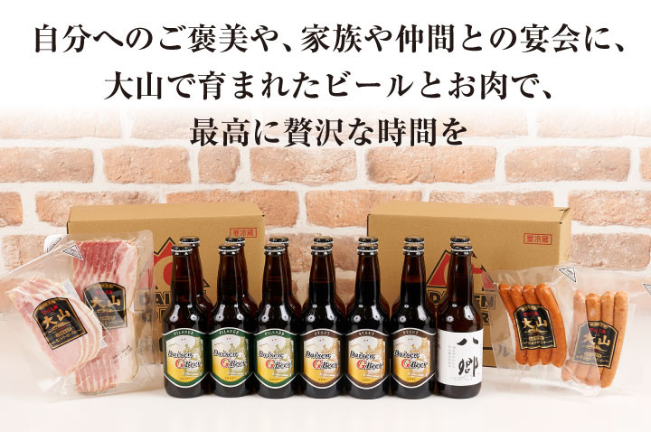 | 容量 | 〈大山Gビール〉ピルスナー・ヴァイツェン・ペールエール・スタウト各330ml×3・八郷ビール各330ml×2〈大山ハム〉カントリーロースト72g・辛口ポチキウインナー120g・あらびきポークウインナー120g・熟成乾塩ベーコン80g各1 |