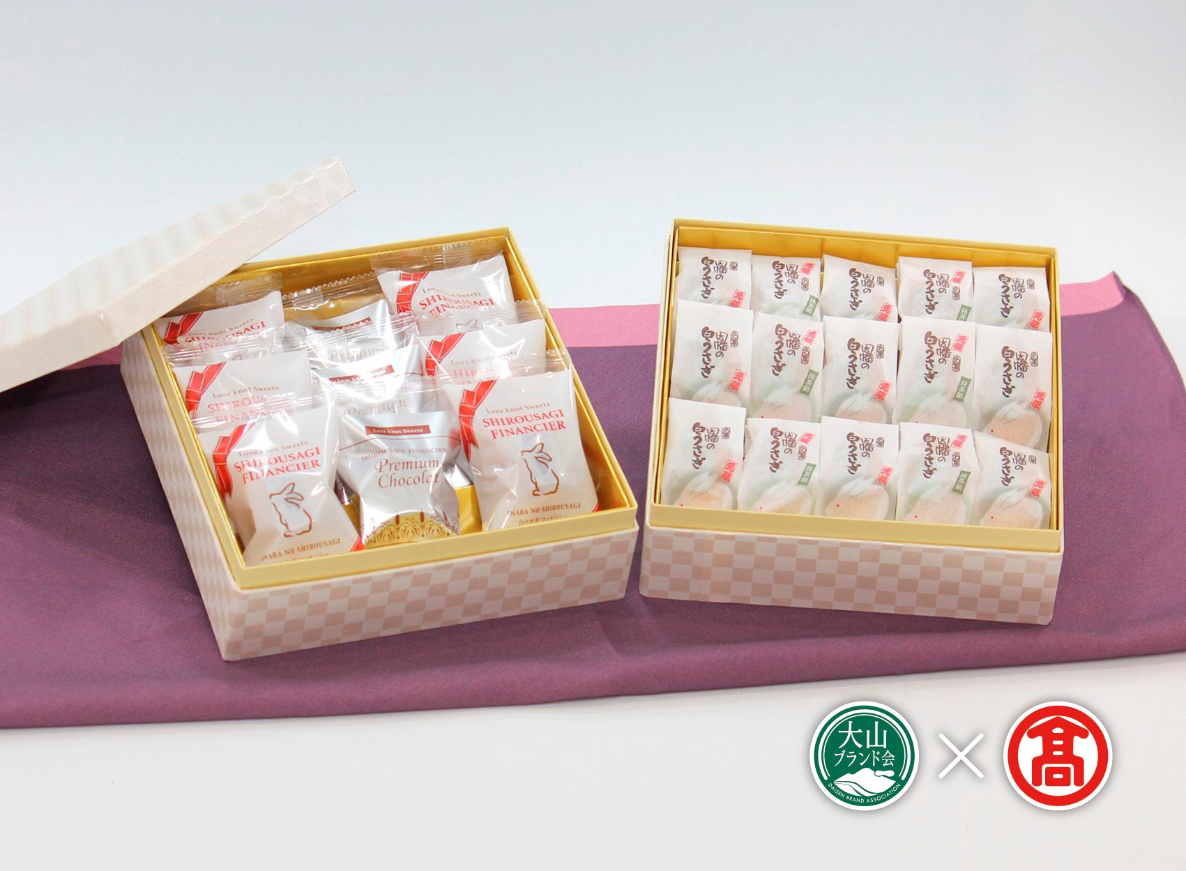 | 容量 | 因幡の白うさぎ×9個、因幡の白うさぎ抹茶餡×6個、白ウサギフィナンシェ×6個、白ウサギフィナンシェプレミアムショコラ×3個 |