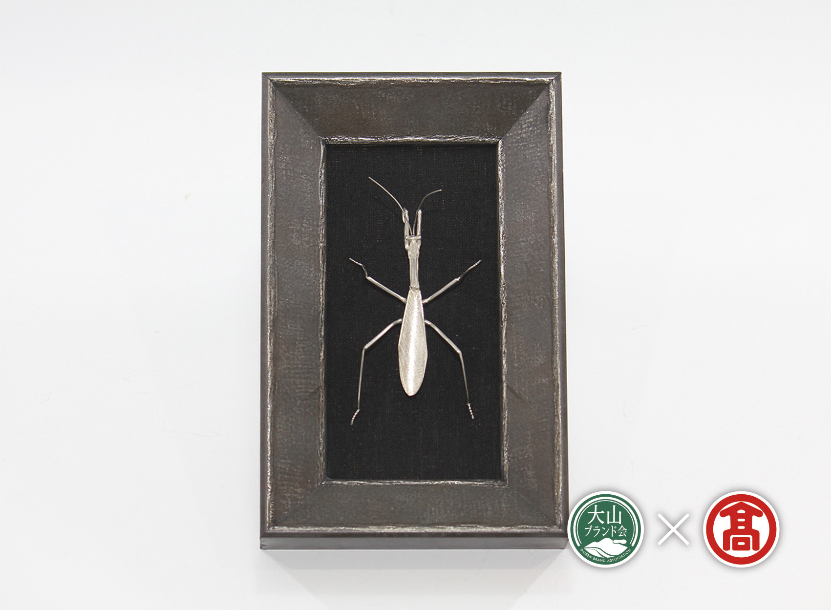 大山の麓にある、金属創作工房が制作した「metal insect series」銀のカマキリの額装作品です。美しくリアルなフォルムが魅力的です。銀の虫はピンで固定されていますので、お手入れのための取り外しも可能です。(提供)tree frog