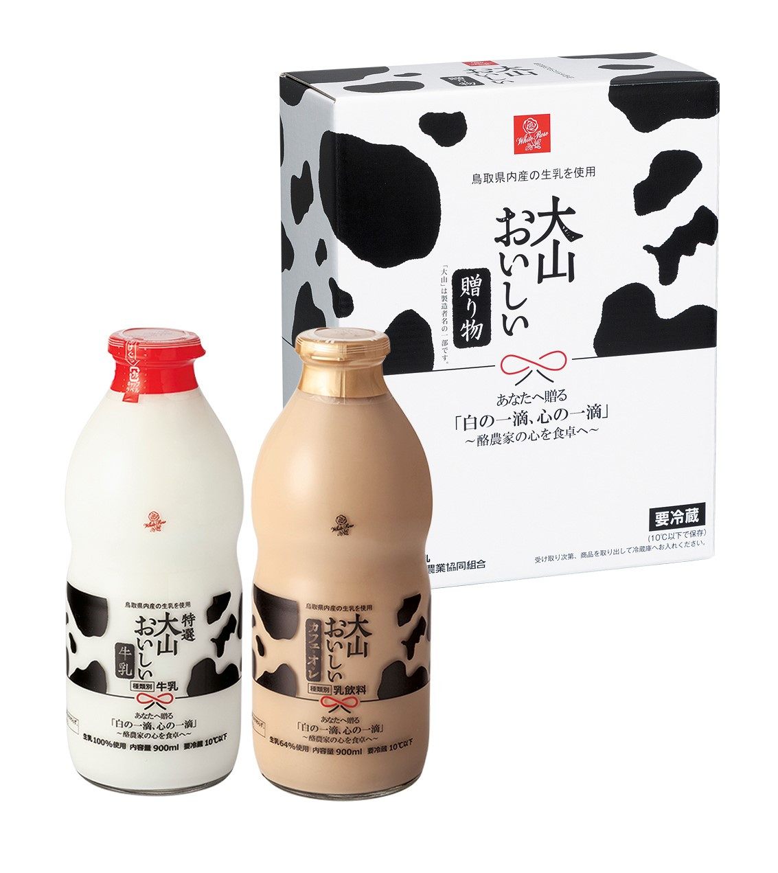 【ミルク&のむヨーグルト】 「特選大山おいしい牛乳」:鳥取県内産の特に乳質の優れた生産者より集乳した高品質の特選牛乳です。120℃2秒間 殺菌 900ml×1本。 「大山おいしいカフェ・オ・レ」:鳥取県内産の生乳をたっぷり64%使用しました。キリマンジャロコーヒーの中でも、生産量が限 られている、農園指定のコーヒー生豆を使用したこだわりのカフェ・オ・レです。900ml×1本。 「鳥取大山のむヨーグルト」:鳥取県内産の生乳と乳製品を使ったこだわりのヨーグルトです。生乳78%使用。750ml×2本。 【焼菓子詰合せ】 自家製の大山バターと生クリームを使用し『ふんわり』感と『しっとり』感にこだわったバウムクーヘン、自家製生クリームを使用した、みるく風味豊かなマドレーヌ、「白バラ牛乳」を生地に使用した、なめらかでしっとりとしたみるくまんじゅうの詰合せです。