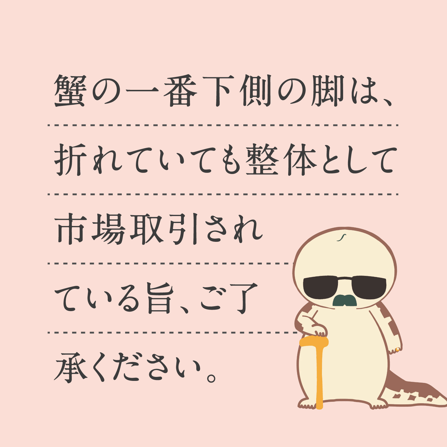 蟹の一番下側の脚は、折れていても整体として市場取引されている旨、ご了承ください。