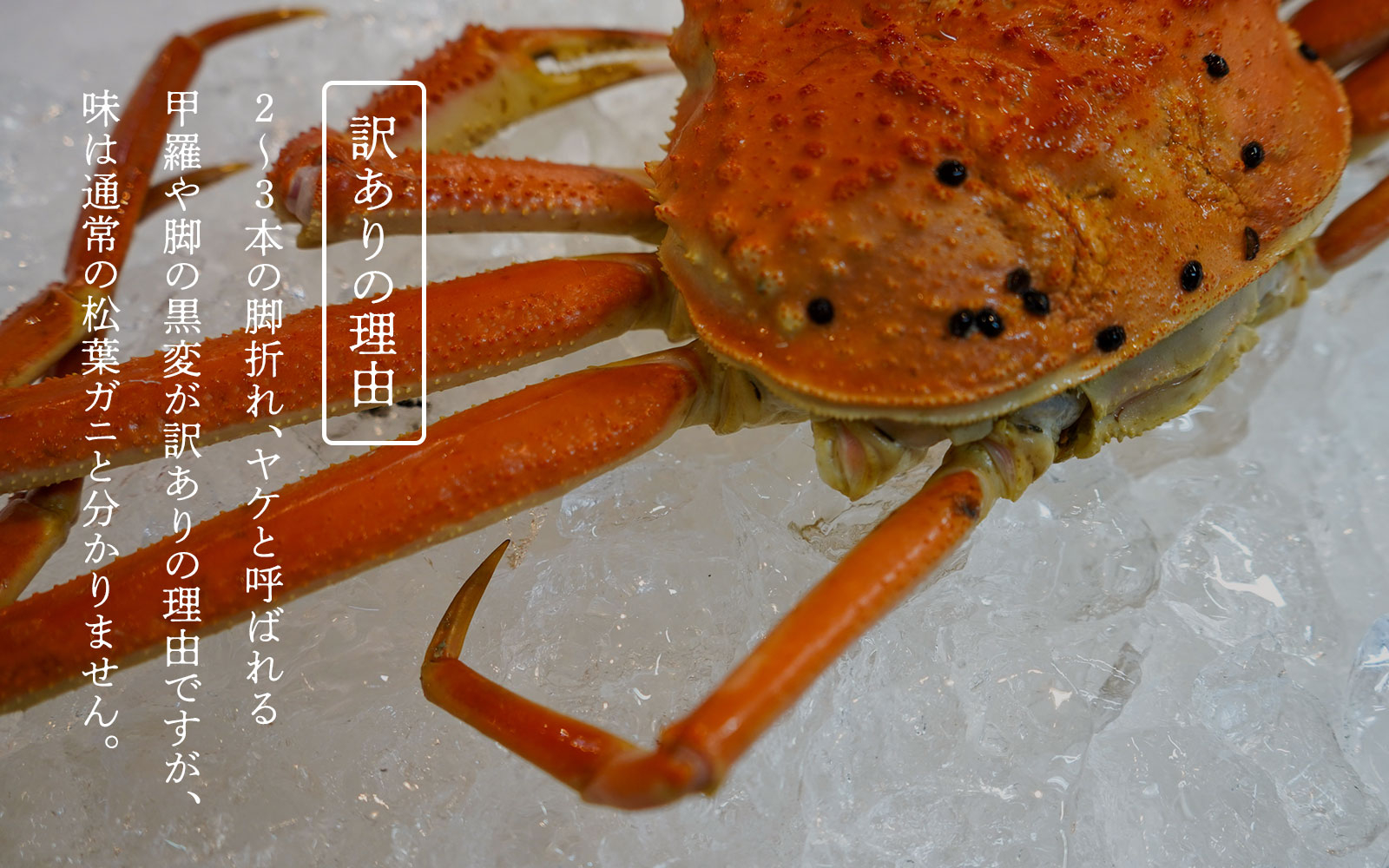 2~3本の脚折れ、ヤケと呼ばれる甲羅や脚の黒変が訳ありの理由ですが、味は通常の松葉ガニと分かりません。