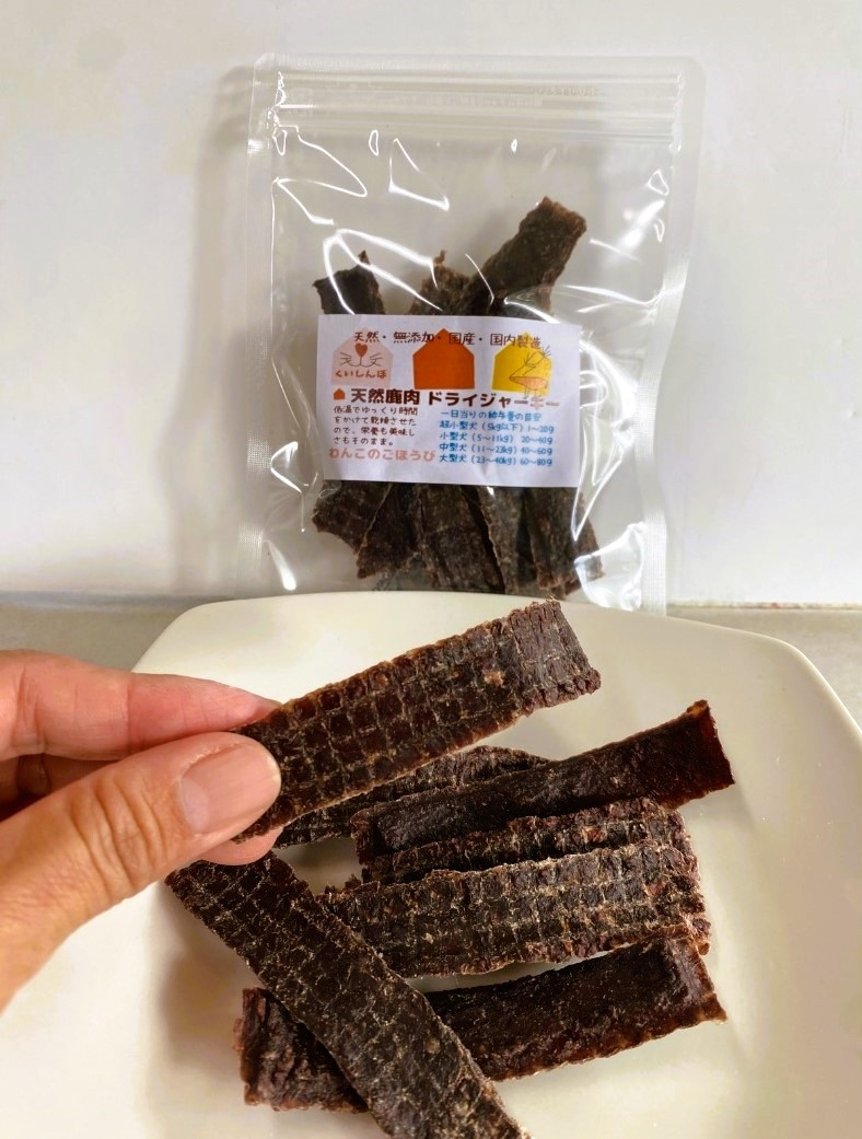 鹿肉ジャーキーは、わんちゃんにぴったりのごほうびです。