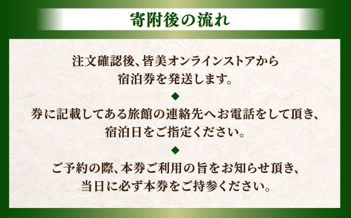 | 容量 | 出雲・玉造温泉 佳翠苑皆美 ミドルクラス宿泊招待券(2名様) 1泊2食付き 【利用可能期間】 宿泊券が届いてから2年間 【宿泊先】 旅館名:佳翠苑皆美 住所:島根県松江市玉湯町玉造1218-8 【寄附後の流れ】 (1)注文確認後、皆美オンラインストアから宿泊券を発送します。 (2)券に記載してある旅館の連絡先へお電話をして頂き、宿泊日をご指定ください。 (3)ご予約の際、本券ご利用の旨をお知らせ頂き、当日に必ず本券をご持参ください。 |