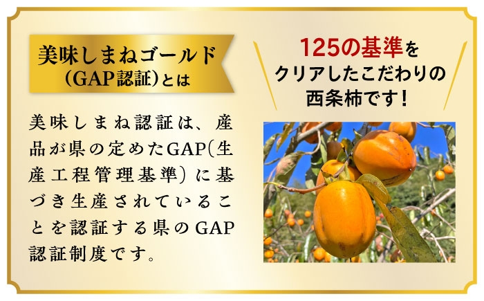 当園の西条柿は、島根県が定めるGAP(生産工程管理基準)に基づき生産されていることを認証するGAP認証制度「美味しまねゴールド認証」を取得しています。