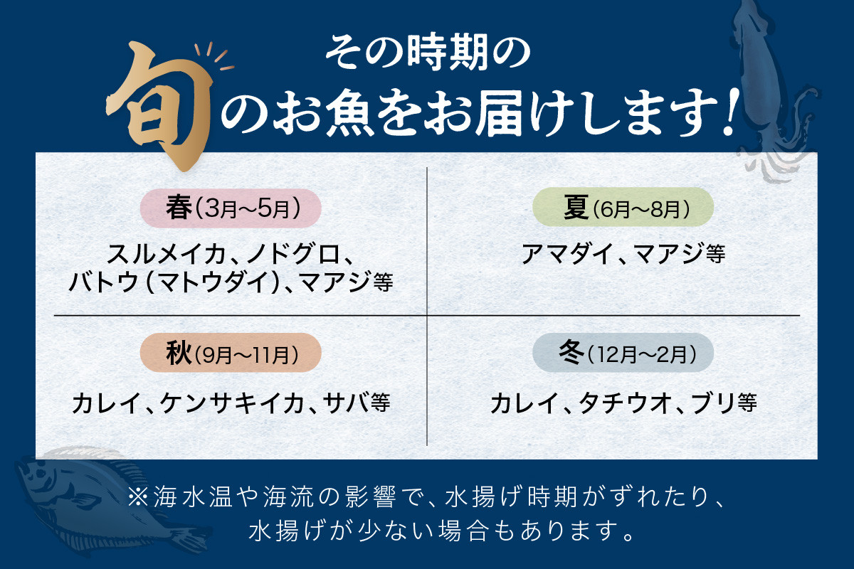 漁場や時期によって水揚げされる魚は異なりますが、全てが厳選された味わい深い品質です。