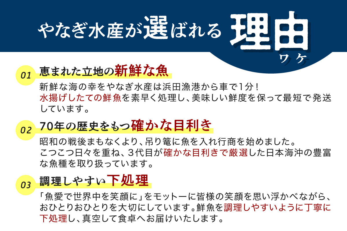 水揚げしたての鮮魚を素早く処理し、日本海で獲れた魚が皆様の食卓を彩るように、鮮度や品質には自信を持って提供しております。