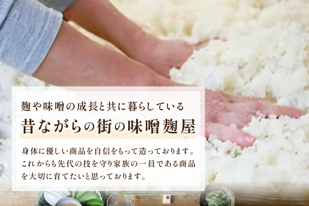私共は、特別な工場は持たず、すべて手仕込みで行い、麹や味噌の成長と共に暮らしている昔ながらの街の味噌麹屋です。