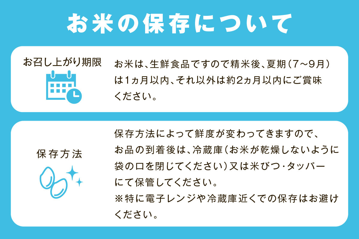 ・保存方法によっては鮮度が変わってきますので、お品の到着後は、冷蔵庫(お米が乾燥しないように袋の口を閉じてください)又は米びつ・タッパーにて保管してください。