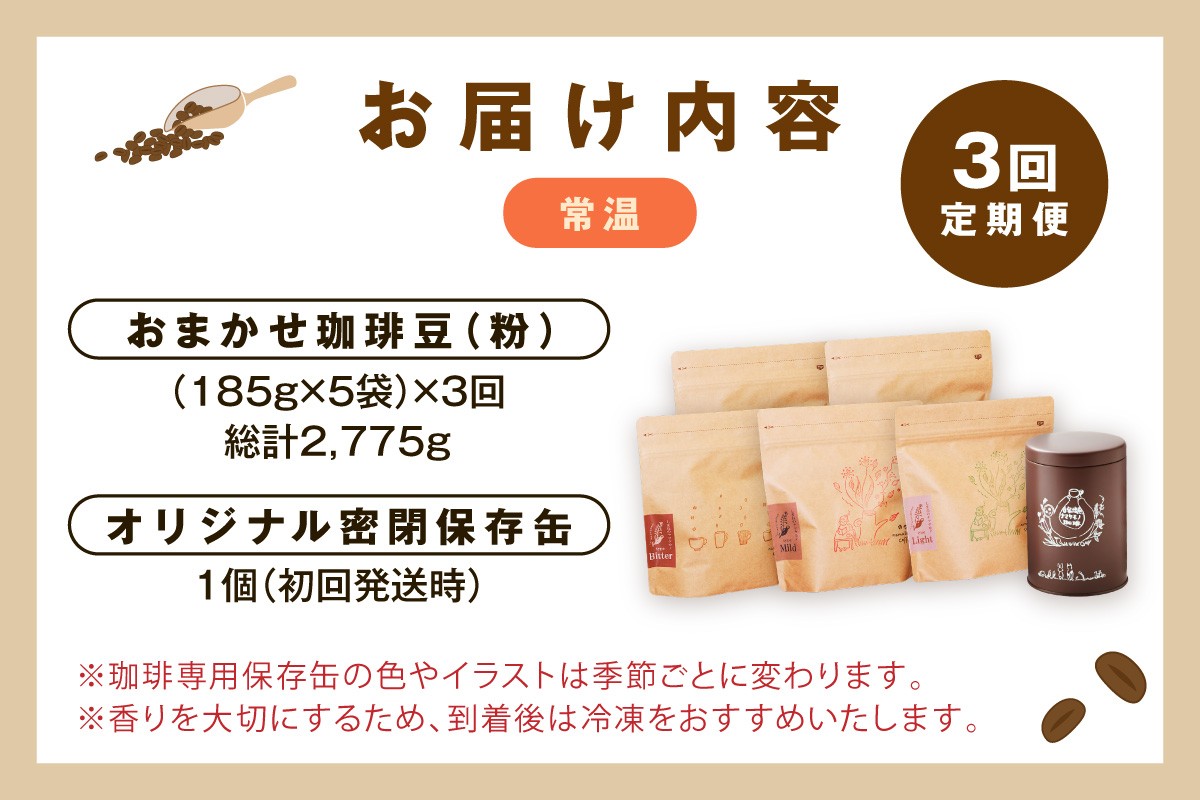 | 容量 | ・925gの珈琲豆(豆または粉)を毎月1回×3回の定期便 小分けの内訳・・・185g×5袋の合計925g ・初回の発送時は、保存缶1個おまけ付きです。 ※珈琲の種類や煎り方は当店おまかせになります。 |