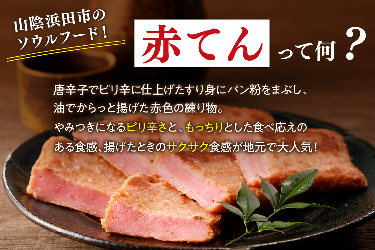 高校2年生まで浜田市に住んでいましたので、「赤てん」が懐かしく、何回も頼んでいます。衣が焦げる程度にフライパンで焼き食べるのが最高の食べ方です。適度のピリ辛が酒のつまみに最高です。