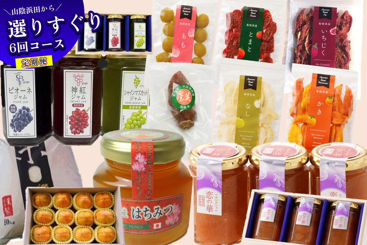 チョイスPayポイントと交換できる品 山陰の美味しいを厳選してお送りいたします。 【定期便】山陰浜田から選りすぐり6回コース 定期便 定期 6回 お楽しみ 選りすぐり 干柿 米 お米 ぶどう ジャム 蜂蜜 百花蜜 ドライフルーツ 柿 西条柿 セット 詰め合わせ 【032_2116】