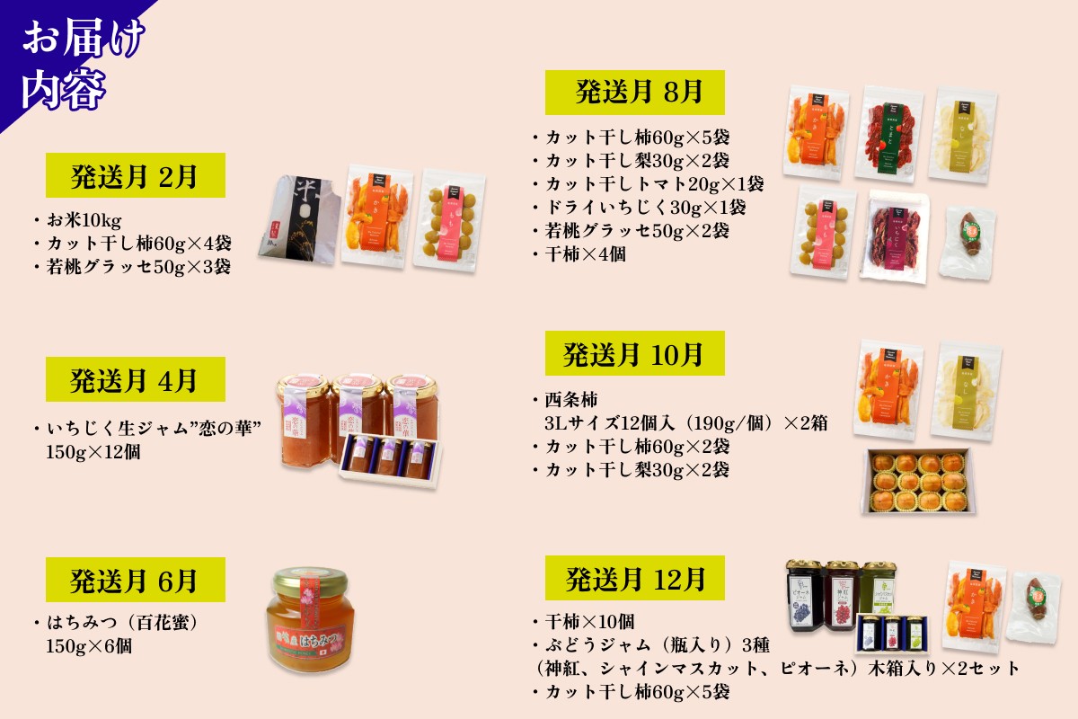 | 容量 | *12月* ぶどうジャム(瓶入り)3種(神紅、シャインマスカット、ピオーネ)木箱入り×2セット 干柿×10個 カット干し柿60g×5袋 *2月* お米10kg カット干し柿60g×4袋 若桃グラッセ50g×3袋 *4月* いちじく生ジャム”恋の華” 150g×12個 *6月* はちみつ(百花蜜)150gx6個 *8月* カット干し柿60g×5袋 カット干し梨30g×2袋 カット干しトマト20g×1袋 ドライいちじく30g×1袋 若桃グラッセ50g×2袋 干柿×4個 *10月* 西条柿3Lサイズ190g×12個×2箱 カット干し柿60g×2袋 カット干し梨30g×2袋 ※偶数月(2か月に1回)に合計6回の定期便でお届け 各月ごとに準備が整い次第発送致しますので、指定日配送はお受けしておりません。あらかじめご了承ください。 |
